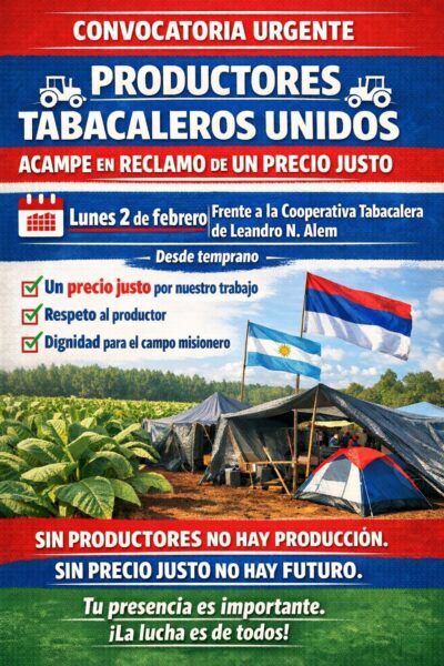 Para el lunes 2 de febrero, fecha en que arranca formalmente el acopio, se prepara una movilización masiva frente a la Cooperativa Tabacalera en Alem
