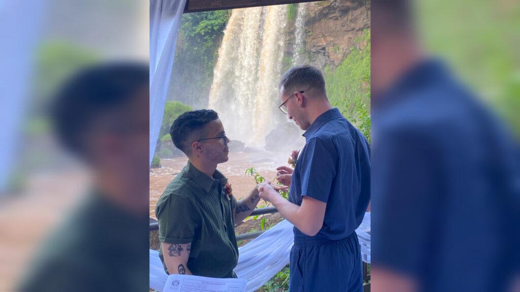 Benjamin Shropshire (Canadá) y Manuel Santiago (Venezuela), tras años de mantener una relación a distancia, lograron contraer matrimonio en el Parque Nacional Iguazú, inaugurando así la legislación que habilita el casamiento en atractivos turísticos misioneros.