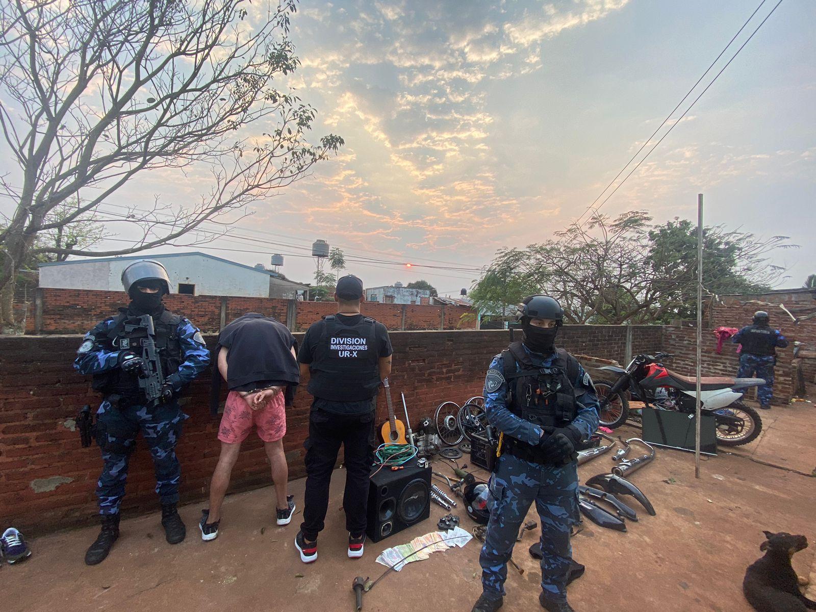 Las irrupciones se llevaron a cabo a las 6 horas, en una vivienda del barrio San Isidro y otra en el barrio Los Patitos, con la Dirección Guardia Infantería. En la primera, atraparon a un hombre de 23 años y secuestraron una Cross sin motor, un cuadro de moto, varias partes de moto, un arma de fuego y objetos presumiblemente robados.