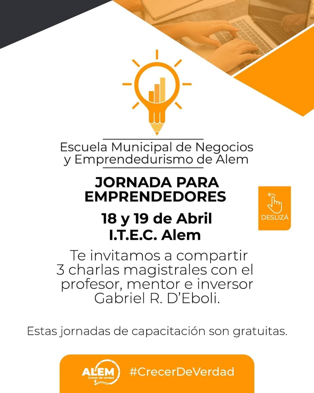 Las ponencias serán bajo la modalidad de Master Class abiertas a cargo del reconocido profesor, mentor e inversor de riesgo Gabriel D`Eboli, quien llega a la ciudad invitado por el intendente Matias Sebely que ofrece esta alternativa a toda la comunidad emprendedora.