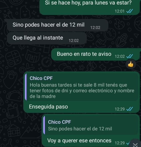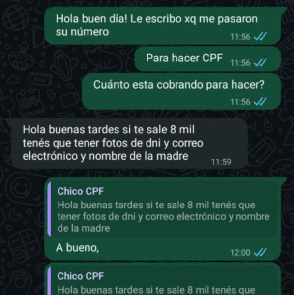 El trámite del CPF: Para «asegurar» el puesto, exigían tener el CPF brasilero. Inmediatamente, Fernando derivaba a las víctimas con un cómplice que supuestamente gestionaba el documento online.