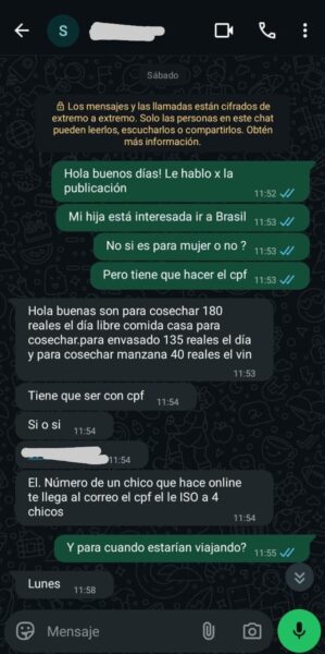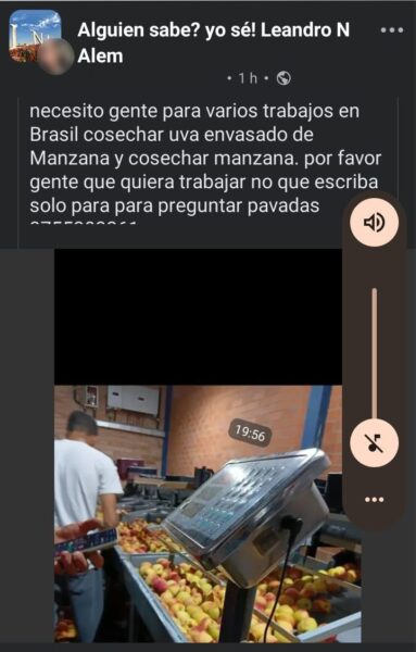 Todo comenzó en Facebook, con un aviso que ofrecía puestos para la cosecha de manzana y uva en el vecino país. Los sueldos prometidos eran «demasiado buenos para ser ciertos»: hasta 4.000 reales por mes (el doble de lo que se paga actualmente), incluyendo casa y comida.