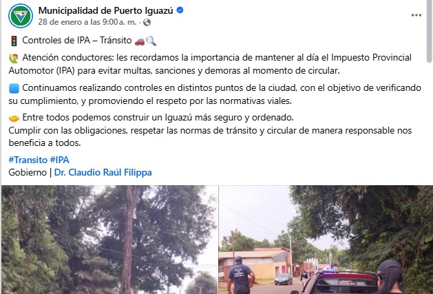 Puerto Iguazú controles IPA deuda patente Filippa Meta Descripción: El municipio de Puerto Iguazú inició operativos de control para verificar el pago del IPA. Bajo la gestión de Claudio Filippa, advierten por multas y sanciones a quienes no tengan el impuesto al día.