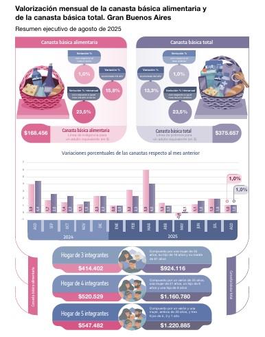 La canasta básica total llegó a $375.657 en agosto de 2025 en el Gran Buenos Aires. Los altos costos dejan a miles de familias bajo presión económica pese a la leve variación mensual del 1%.