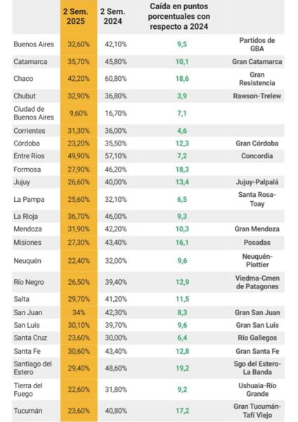 En la Patagonia, el centro urbano mejor posicionado fue Neuquén-Plottier (22,4%), mientras que en el Noroeste se destacó el Gran Tucumán-Tafí Viejo con un 23,6%. Ciudades como Bahía Blanca o Corrientes mostraron las recuperaciones más lentas, con bajas de apenas el 2,9% y 4,7% respectivamente, quedando rezagadas frente al promedio nacional de mejora.