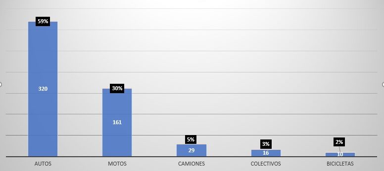Los automóviles representan la mayoría de los siniestros, seguidos por las motocicletas. Sin embargo, la vulnerabilidad de los motociclistas suele elevar las cifras de mortalidad en proporción.