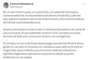 Florencio Randazzo renunció al partido en desacuerdo con la candidatura de Cristina Fernández de Kirchner para presidir el PJ Nacional. Dijo «Quédense con los cargos»,