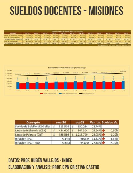 El salario de una Maestra de Grado que inicia su carrera en Misiones muestra una tendencia preocupante: sube en términos nominales, pero cae sistemáticamente frente a la inflación y al costo de vida real. Así lo reflejan los datos entre noviembre de 2024 y octubre de 2025, período en el que la docente inicial perdió poder adquisitivo tanto frente al IPC nacional como frente a la inflación regional del NEA.
