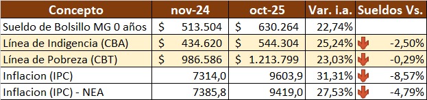 Según el relevamiento, el sueldo neto pasó de $513.504 (nov-24) a $630.264 (oct-25), lo que implica un aumento nominal del 22,74%. Sin embargo, la inflación nacional en ese mismo lapso llegó a 31,31%, y la regional a 27,53%. El resultado: una pérdida real del -8,57% frente al IPC y del -4,79% frente al NEA.