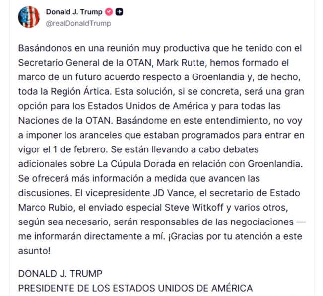 El anuncio no es solo una cuestión de mapas, sino de bolsillo: gracias a este entendimiento, Trump confirmó que no se aplicarán los aranceles que estaban programados para el 1 de febrero, una amenaza que tenía en vilo a los mercados europeos.
